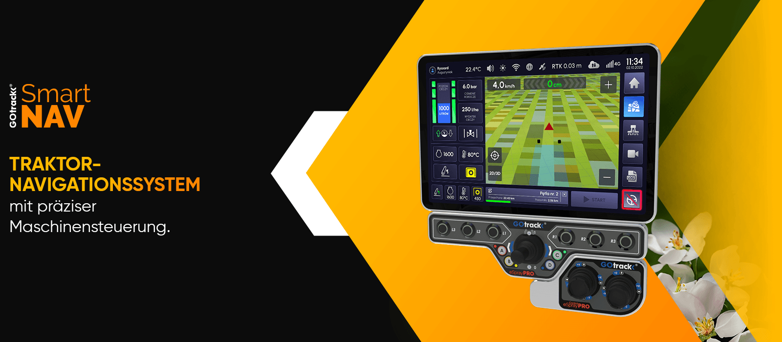 Smart NAV – automatische Traktornavigation mit Maschinensteuerung, einschließlich Feldspritzen, basierend auf variablen Ausbringmengenkarten (VAR), mit der Möglichkeit des Fernzugriffs und der Fernverwaltung über die mobile Anwendung GOtrack APP und die Plattform GOtrack Farm MANAGER.